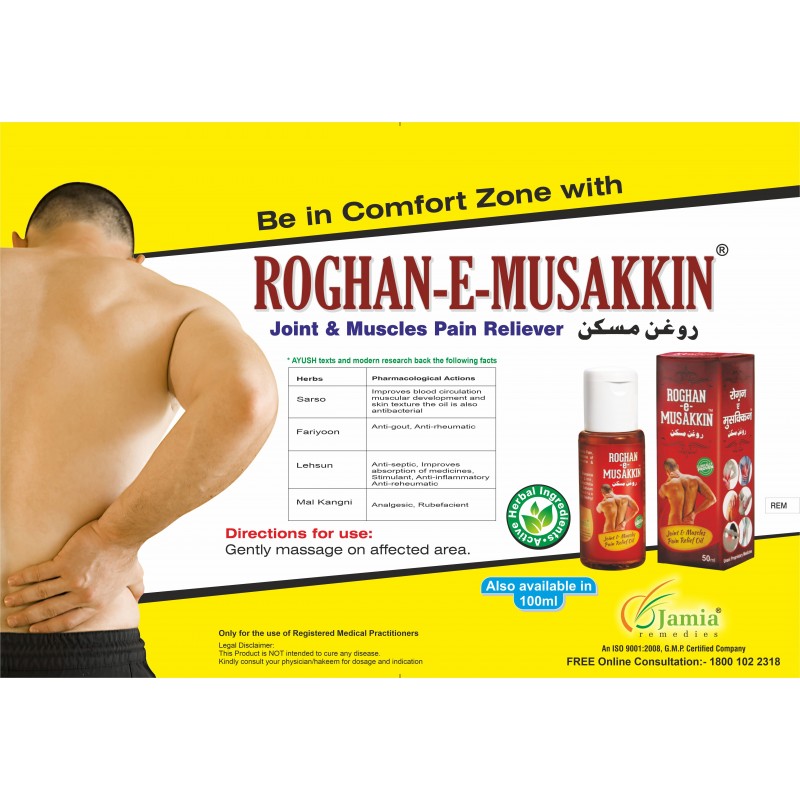 Roghan-E-Musakkin Oil is a traditional herbal formulation crafted to provide effective relief from joint and muscle pain. Our potent blend of natural ingredients penetrates deeply into the affected area, soothing inflammation, reducing stiffness, and promoting mobility.